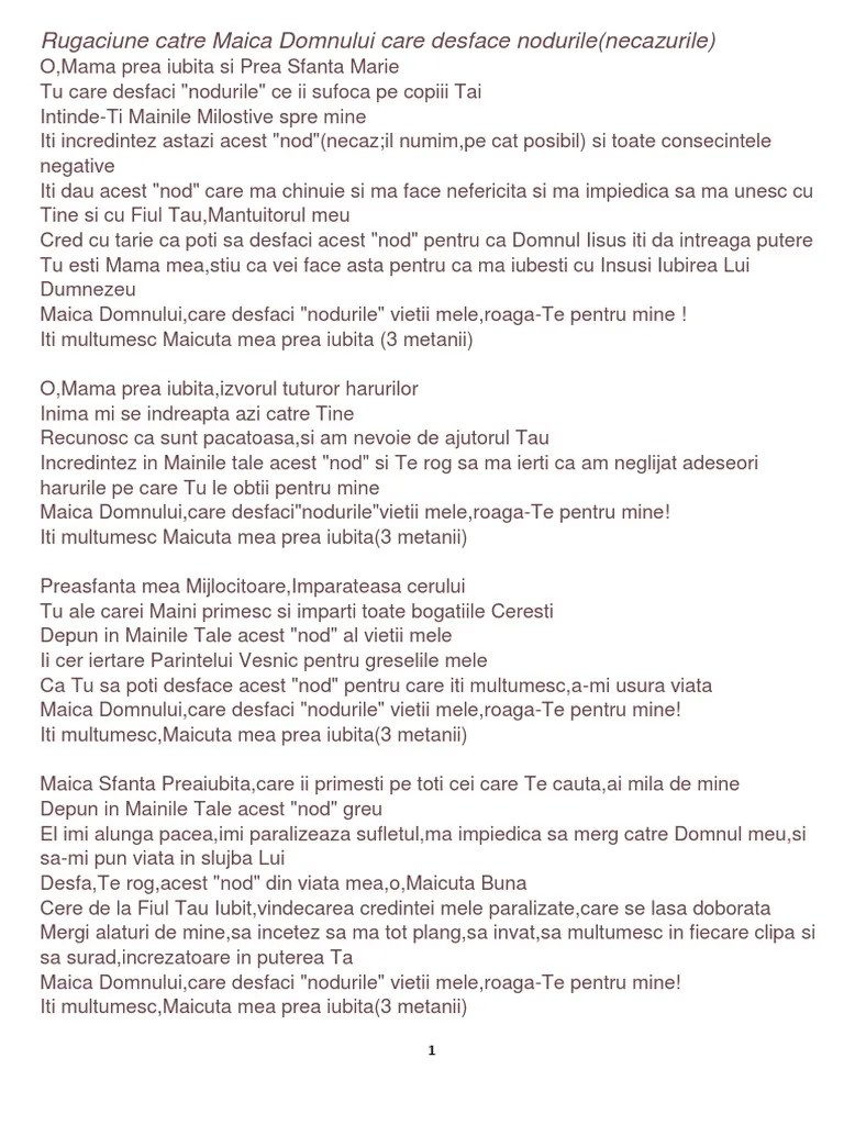 Îţi dau acest nod care mă chinuie, mă face nefericit.. Aceasta rugaciune este recunoscuta pentru curatarea sufletului de gandurile negative si indreptarea in fata lui. Rugaciune catre maica domnului care desface nodurile (necazurile) e nevoie ca toti crestinii sa aiba in fiecare zi un ragaz inchinat rugaciunii personale. Iata, in cele ce urmeaza, rugaciune. Iti multumesc, maicuta mea preaiubita!.. Înalță rugăciunile noastre la tronul lui dumnezeu și fiul tău, ca să fie milostiv nedreptăților.